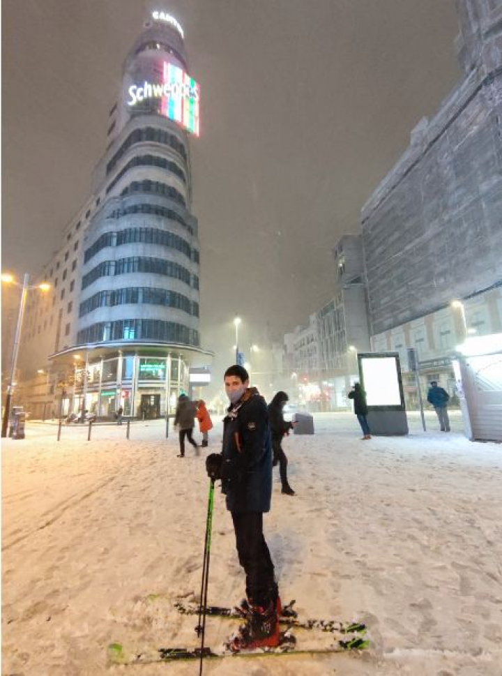 Eso sí, antes quiso hacerse una foto delante de una de las construcciones más emblemáticas de la capital: “Me acorde de El Día de la bestia, del edificio de Schweppes, y dije ‘oye pues estaría bien hacerse una foto con los esquís estilo día totalmente atípico’”.