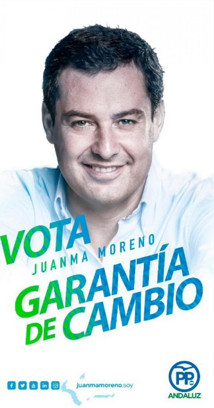 Se supone que el buen hombre está sonriendo para ganarse la confianza de los votantes pero, ¿no había otra foto menos inquietante? Será por imágenes de Moreno sonriendo. Señores del PP, aquí les dejamos una: