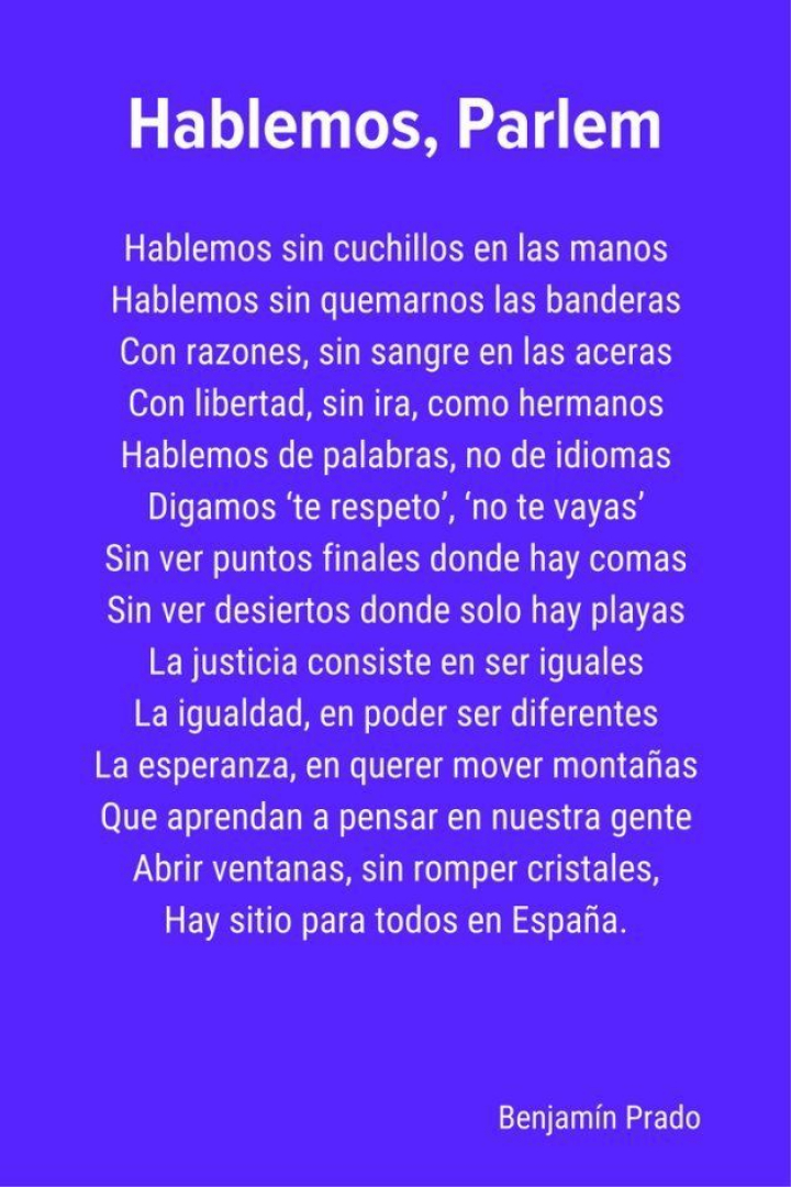 Hablar, dialogar, charlar. En pleno estado de crispación, de gente enfadada, de políticos encastillados, de tensiones... Cinco días después de la celebración del referéndum ilegal por la independencia de Cataluña, el poeta Benjamín Prado propone el diálogo como solución. Y lo hace como mejor sabe hacerlo, con las palabras, con los versos.