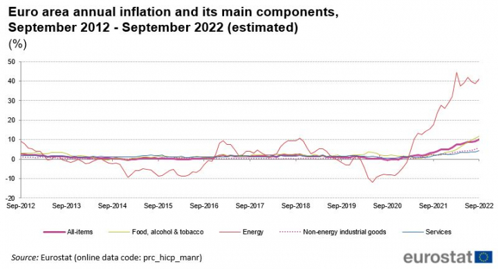 El Fondo Monetario Internacional (FMI) alertó ya en abril del riesgo de tensiones sociales en los países europeos ante la escalada de precios de la energía y los alimentos en la región, al calor de la invasión rusa de Ucrania. Pronosticaba especiales problemas en los países receptores de refugiados. Eran los tiempos de las huidas masivas y la situación, en lo social, en el asilo, se ha estabilizado por completo. No así los precios. Según Eurostat, la inflación de la eurozona marca un nuevo récord con el 10% en septiembre. La principal causa de la subida fue el incremento de los precios de la energía, que se aceleró hasta el 40,8% poniendo fin a la ligera moderación que se había registrado en julio (39,6%) y agosto (38,6%), tras haber alcanzado un 42% en junio.