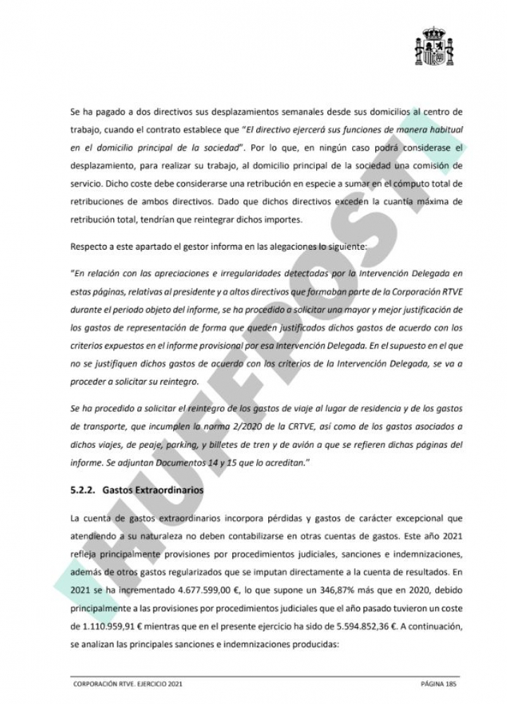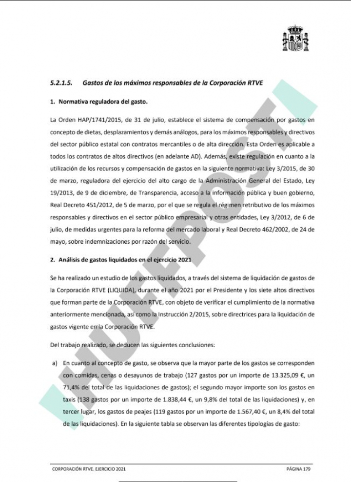 El informe definitivo de la Intervención General de la Administración del Estado (IGAE) ya ha llegado a RTVE y confirma todas las irregularidades de la cúpula de José Manuel Pérez Tornero que El HuffPost adelantó en exclusiva el pasado mes de diciembre. El documento al que ha tenido acceso este medio no deja margen a la duda. Las conclusiones son demoledoras y señalan explícitamente reiterados gastos injustificados en comidas, cenas, transporte e incluso “bebidas alcohólicas” por parte de la mencionada alta directiva en la Corporación.