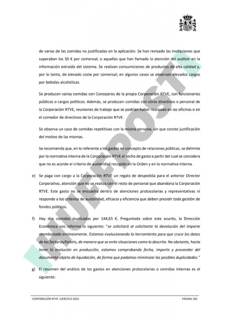 En el análisis también se han recopilado “gastos cuyo contenido no tiene nada que ver con el cargo que ostenta el directivo en la organización o, reuniones sobre las líneas estratégicas de la Corporación RTVE que podrían no ser acordes con el principio de independencia de la Corporación RTVE”. Incluso, hace mención al pago con dinero público de un regalo de despedida al ex Director Corporativo: “Este gasto no se encuadra dentro de atenciones protocolarias y representativas ni responde a los criterios de austeridad, eficacia y eficiencia que deben presidir toda gestión de fondos públicos”, alertan desde Hacienda.