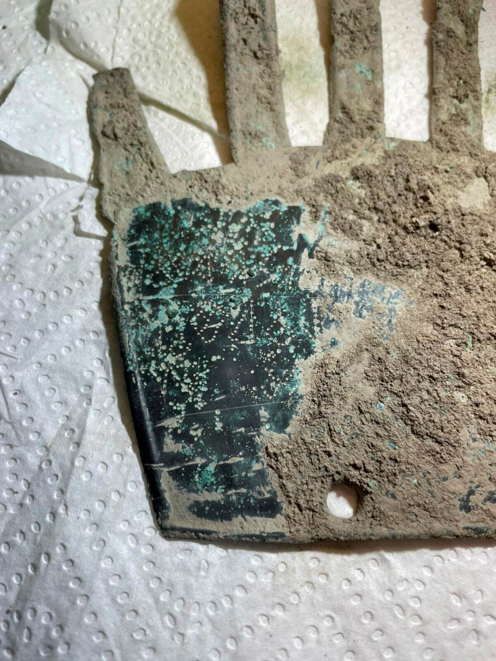 La ‘mano de Irulegi’, una figura de bronce de apenas 14 centímetros, 35 gramos y 2.100 años de antigüedad, fue realmente extraída el 18 de junio de 2021 y llevada al depósito del Gobierno de Navarra el 13 de julio de ese año. Ahí esperaría seis meses su turno de limpieza, hasta pasar por las manos de las restauradoras del servicio de patrimonio navarro. Finalmente, la ‘afortunada’ fue la restauradora de patrimonio Carmen Usúa, quien empezó a retirar todo el sedimento y vio que la pieza tenía dedos, tenía uñas y, lo más importante, tenía una inscripción.