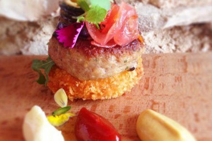 Escoger las lentejas una a una. Ponerlas en un colador grande o chino, y lavarlas debajo del grifo. Pasarlas a una olla apropiada para cocinarlas, añadir el caldo de verduras y llevarlas a ebullición con la rama de romero durante 45 minutos aproximadamente. Sazonar y vigilar que el caldo siempre este al ras de las lentejas por si hay que añadir un poco de agua. Una vez en su punto, dejar reposar 10 minutos y escurrirlas. Mientras, saltear los champiñones con los ajos en el aceite a fuego mediano en una olla ancha; ¡no dejar que nada se dore! y el tartufo. Dejar cocinar 5 minutos, incorporar las lentejas bien escurridas, remover 2 minutos a fuego lento e incorporar el cilantro, el cebollino chico picado y el Ras-el- Hanout. Escurrir todo, añadir el camote asado y como si de una masa de pan se tratara trabajar la mezcla delicadamente. Separar en porciones de 120g y reservar durante 6 horas en frío.