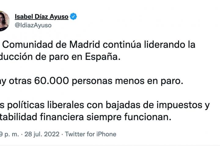 “La Comunidad de Madrid continúa liderando la reducción de paro en España. Hay otras 60.000 personas menos en paro. Las políticas liberales con bajadas de impuestos y estabilidad financiera siempre funcionan”, escribió la líder del PP de Madrid este jueves después de conocerse los datos de paro.