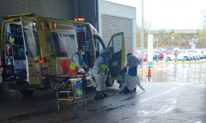 La imagen no puede ser más impactante: dos personas con un traje blanco de arriba a abajo, guantes azules y unas gafas que cubren lo único que queda al descubierto: los pómulos y los ojos. Llaman la atención los pies: sobre los zapatos llevan bolsas de basura. Bajan a los pacientes y a su vuelta tardan alrededor de 20 minutos en quitarse los trajes unos a otros cuidadosamente, sin tocar nada, metiéndolos después en otras bolsas de basura y cerrándolas a conciencia. Echándose desinfectante ellos y por todos los utensilios. Frotando la camilla con fuerza y esmero. “Son días duros y estamos hasta arriba”, dice el conductor de la UCI móvil, que por dentro está completamente cubierta de plástico transparente: techo, paredes y suelo.