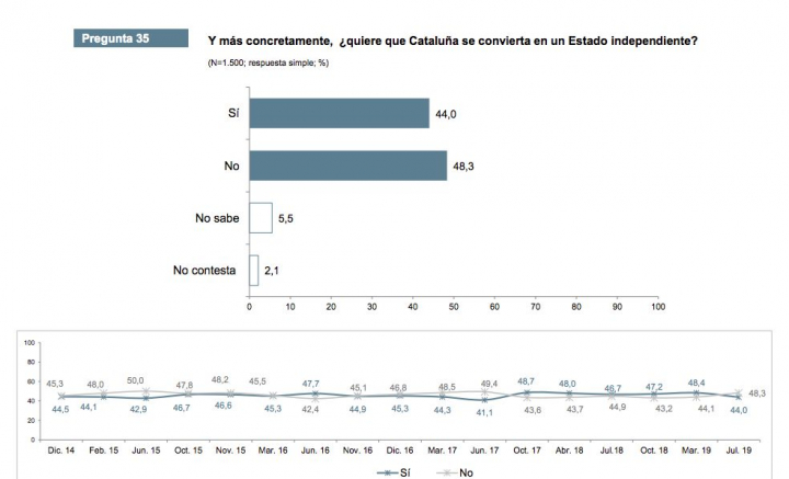 Es la primera vez desde junio de 2017 que una encuesta del CEO señala que hay más catalanes en contra de la independencia que a favor, y se han invertido las posiciones respecto al último barómetro de marzo de 2019: entonces el 48,4% apoyaba la independencia y el 44,1% la rechazaba.