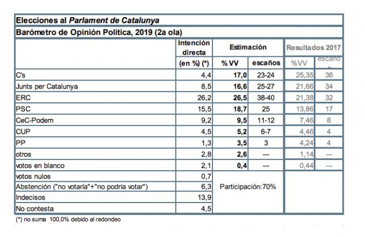 Ganaría las elecciones ERC, que obtiene el 26,5% de los votos y entre 38 y 40 escaños (ahora tiene 32). El PSC sería la segunda fuerza con el 18,7% y 25 escaños, una estimación de diputados similar a la de Junts per Catalunya, que logra el 16,6% de los votos y entre 25 y 27 asientos.