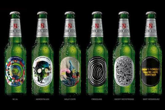Los botellines de los diseñadores Artists M.I.A., Geoff McFetridge, Bert Rodriguez, Aerosyn-Lex, Freegums y Willy Chyr para la cerveza Becks en 2012.