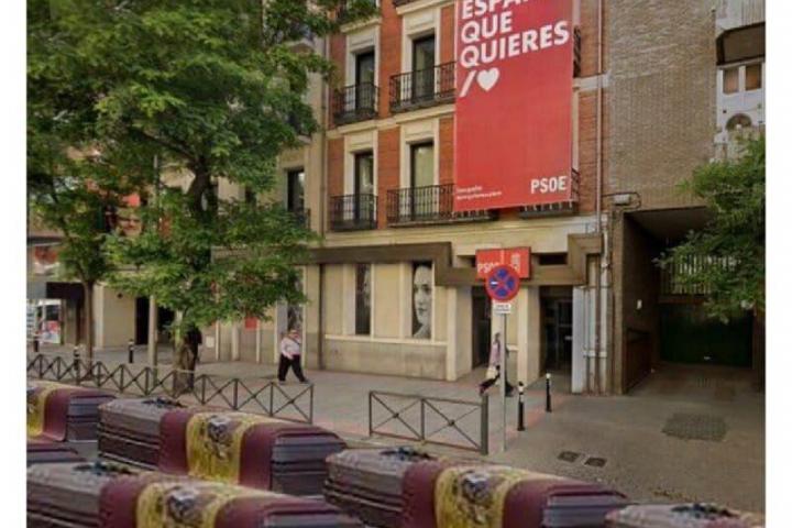 En este montaje se ve la sede del PSOE en la calle Ferraz de Madrid con féretros iguales a los de ese montaje, que se hizo tras usar sin permiso una imagen del fotógrafo Ignacio Pereira.