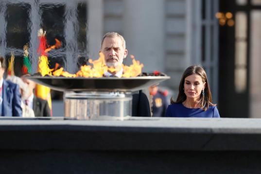 Tras recoger las Grandes Cruces -en realidad se han entregado 37 condecoraciones a miembros de la sociedad civil, continuando tras el final del acto-, Felipe VI y Letizia han realizado una ofrenda floral ante el pebetero que ya es símbolo de estos homenajes.