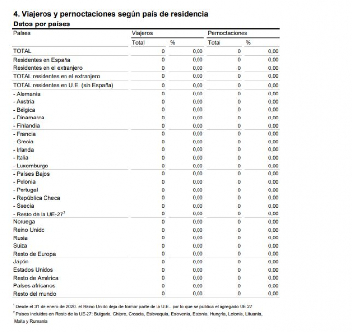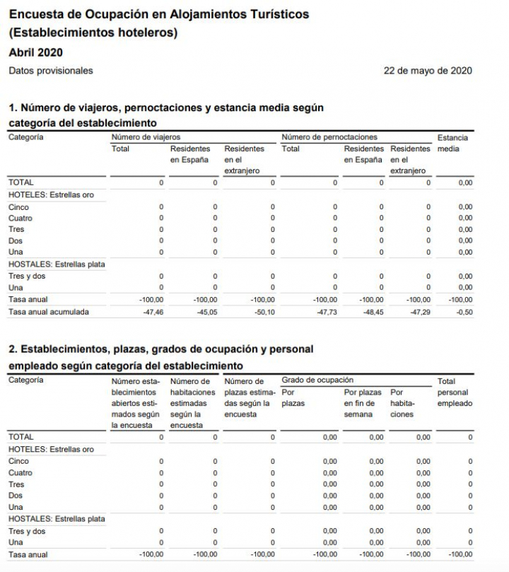 El cierre obligatorio de los hoteles desde el pasado 26 de marzo hace que los datos de abril sobre número de establecimientos abiertos, plazas ofertadas, habitaciones disponibles, viajeros recibidos y pernoctaciones sean cero en todo el territorio nacional.