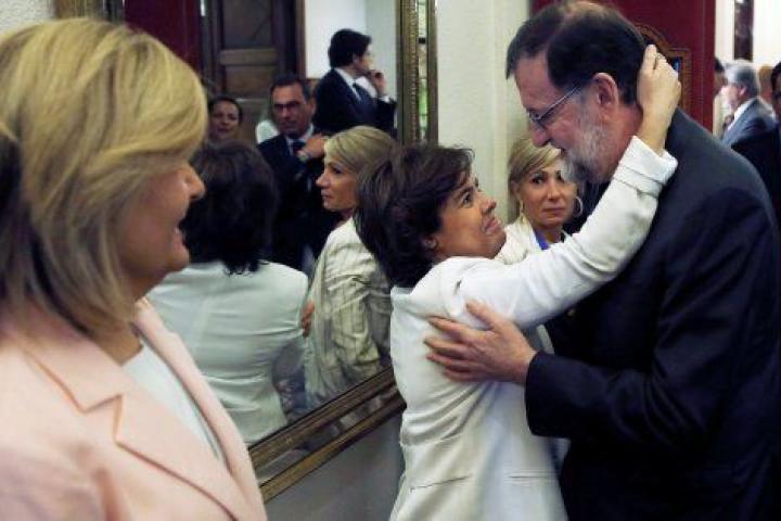 La vicepresidenta del gobierno es de las últimas en dejar el Congreso. La ministra de Empleo y un grupo de trabajadores de prensa del PP le acompañan. Intentan ayudarle a a superar el mal trago, a rebasar la descomunal barrera de periodistas y cámaras que se amontonan en el patio. Lo peor viene después. Podemos ha movilizado a los suyos. Hay mucha gente al otro lado de la calle esperando para abuchear a los miembros del Gobierno popular. Lo acaban de hacer con Rajoy. Un corresponsal de la BBC persigue a la vicepresidenta hasta la verja: "How are you feeling?" (¿Cómo se siente?) Silencio.