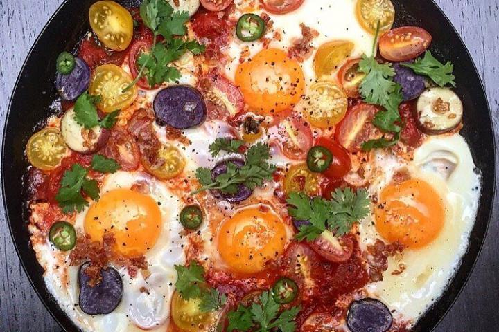 Huevos con salsa pomodoro, tomates dulces, feta y cilantro