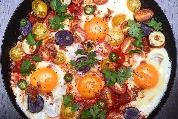 Huevos con salsa pomodoro, tomates dulces, feta y cilantro