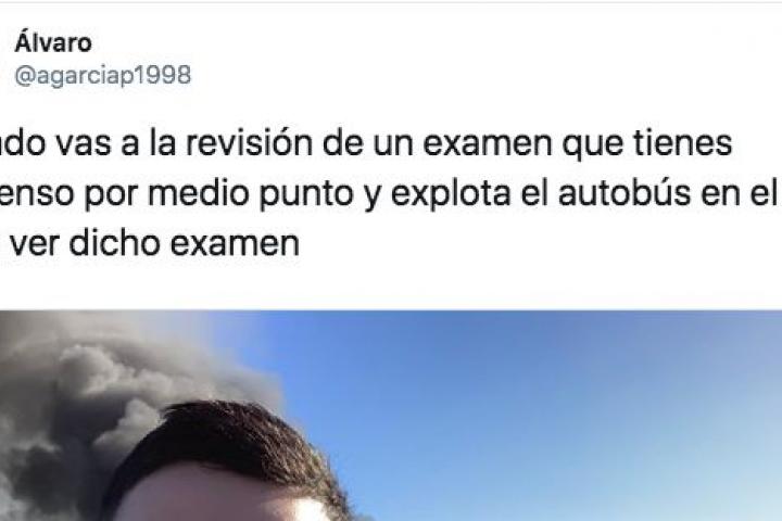 “Cuando vas a la revisión de un examen que tienes suspenso por medio punto y explota el autobús en el que vas a ver dicho examen”, escribió en un mensaje que en un día lleva más de 21.000 ‘me gusta’ y 3.300 retuits.