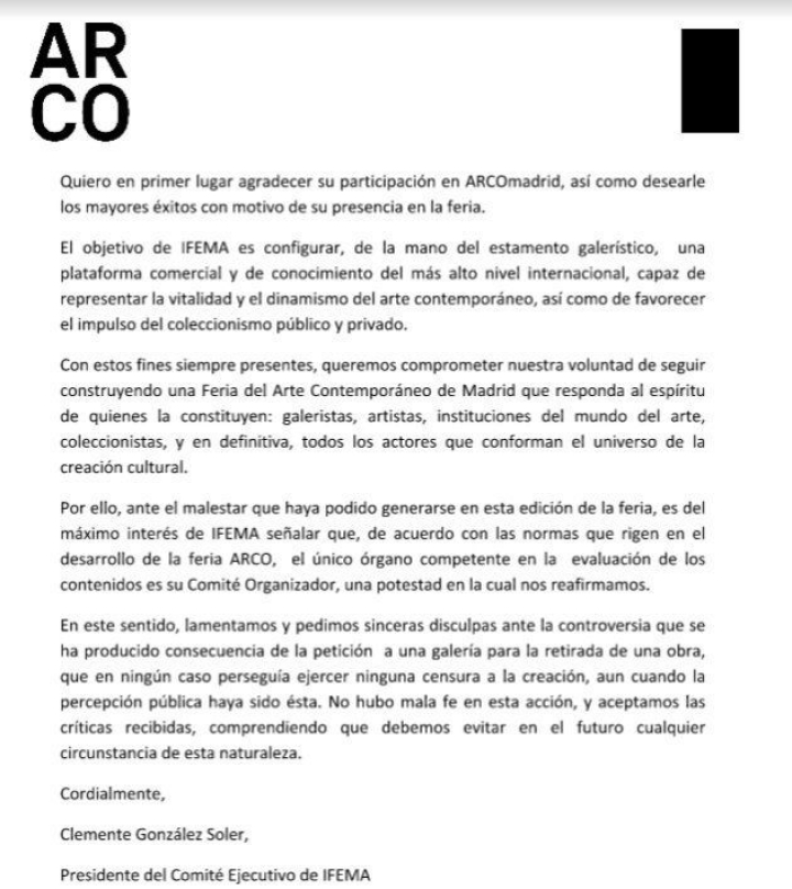 El presidente ejecutivo de Ifema, Clemente González Soler, ha remitido un escrito a los galeristas de la feria ARCOmadrid en la que pide disculpas por la polémica generada por la retirada de la obra Presos Políticos. En el texto, asegura que "en ningún caso perseguía ejercer ninguna censura a la creación" y relata que no "hubo mala fe".