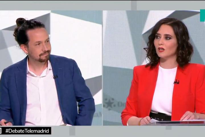El candidato de Unidas Podemos a las próximas elecciones de la Comunidad de Madrid, Pablo Iglesias, mantuvo en debate de Telemadrid un tenso encontronazo con la presidenta de la región y candidata del PP, Isabel Díaz Ayuso.