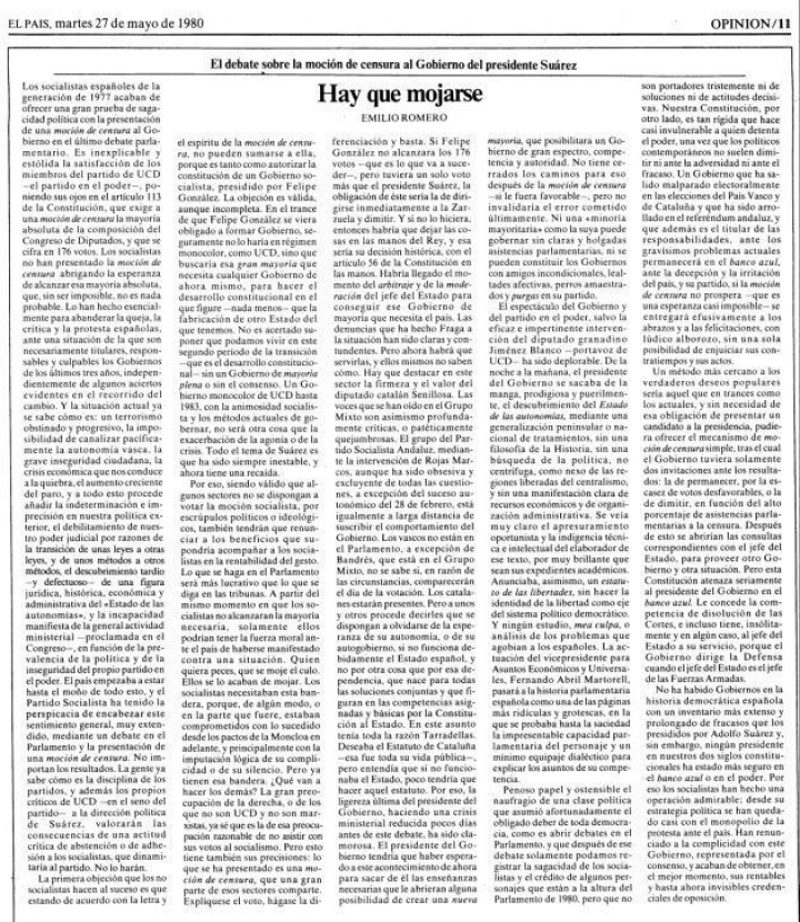 El entrecomillado pertenece a Emilio Romero. Lo escribió en la páginas del diario El País el 27 de mayo de 1980 con motivo de la moción de censura que Felipe González presentó contra Adolfo Suárez. El periodista, que no era precisamente un rojo peligroso sino todo lo contrario, llegó a calificar en la misma tribuna de "gran prueba de sagacidad política" la iniciativa del PSOE, aun a sabiendas de que no prosperaría.
