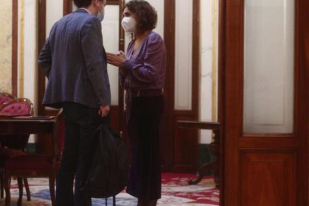 El vicepresidente segundo del Gobierno, Pablo Iglesias, y la ministra de Hacienda, la socialista María Jesús Montero, han protagonizado este miércoles una tensa conversación en los pasillos del Congreso hasta el punto de que se ha oído a la portavoz pedir al líder de Podemos que no sea “cabezón”.
