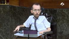 Mientras transcurría el debate en el Pleno del Congreso sobre los últimos Consejos Europeos y la evolución de la pandemia del coronavirus, Iglesias y Montero se han salido a uno de los salones próximos al hemiciclo para mantener una charla aparte.