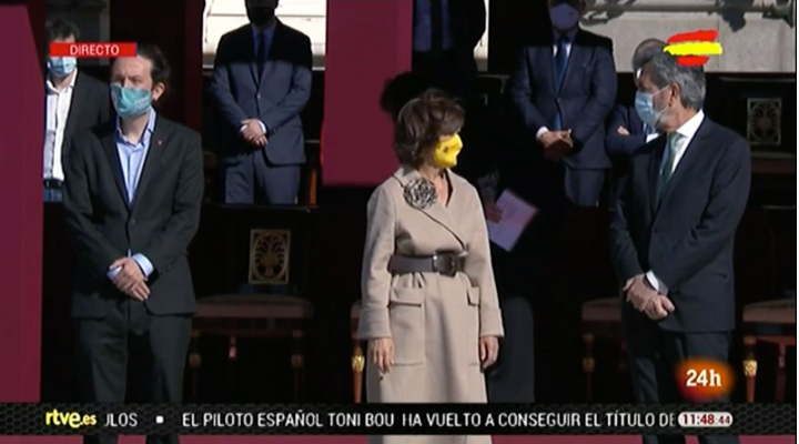 El acto en el que ha usado esta prenda está presidido por los reyes. Se celebra en Palacio Real y el único acto de celebración del Día de la Fiesta Nacional, una reducida conmemoración a causa de la pandemia de coronavirus a la que asistirá el Gobierno en pleno y representantes de todos los poderes del Estado.