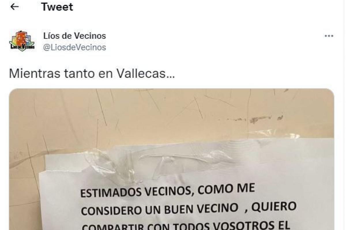 “Mientras tanto en Vallecas…”, ha escrito la cuenta @LiosdeVecinos junto a la foto del cartel.
