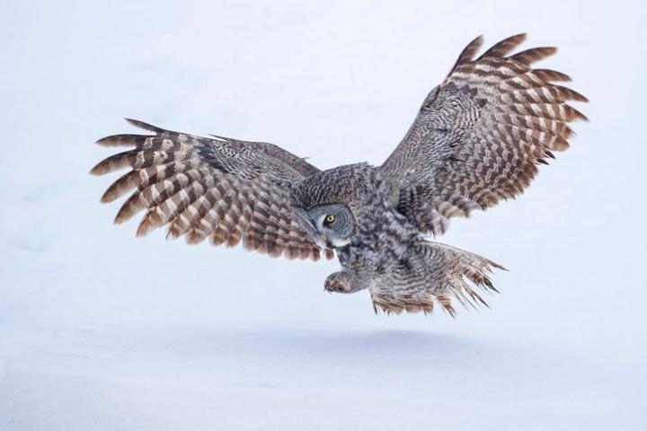 La implacable estrategia del búho gris para cazar a las presas escondidas bajo la nieve