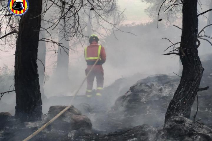El Consorcio Provincial de Bomberos de Valencia ha indicado que continúan las tareas de extinción, que se complican por las condiciones meteorológicas de altas temperaturas, baja humedad y viento de poniente.