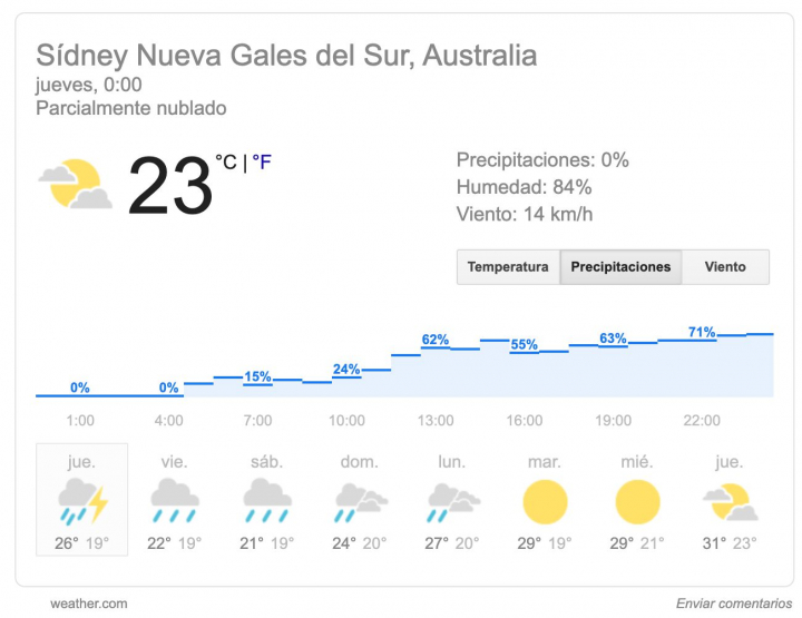 El día de hoy aumentó el optimismo por previsiones de fuerte lluvia en algunas zonas de los estados de Victoria y Nueva Gales del Sur, dos de los estados que más sufrieron los efectos de las altas temperaturas y los incendios. Según la meteoróloga del gobierno Sarah Scully, la lluvia debería llegar el miércoles al este de Australia y durar por lo menos hasta el fin de semana.