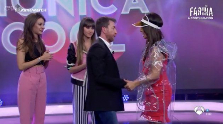 Al principio del programa ya había salido a la actriz con una especie de chubasquero transparente y había participado en el baile inicial, algo que no pasó desapercibido par a los usuarios de Twitter.