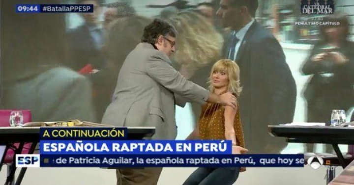 De Prada se puso a la misma altura que la presentadora y le colocó los brazos en el hombro.