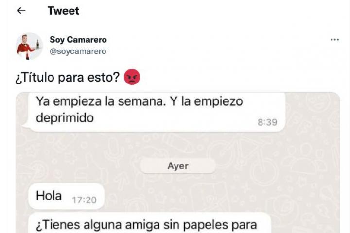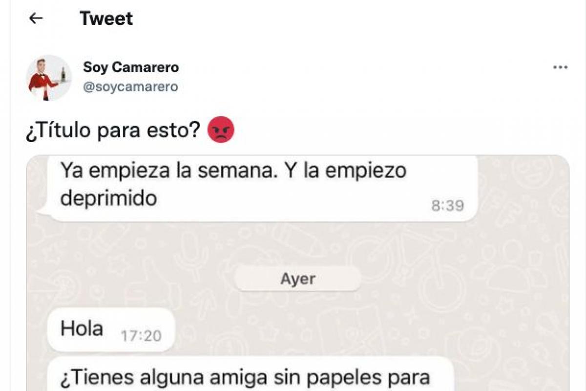 El último ejemplo que ha subido a la red social ha causado una honda indignación entre múltiples usuarios. Se trata de una conversación que alguien enviado por un hostelero mantiene con otra persona.