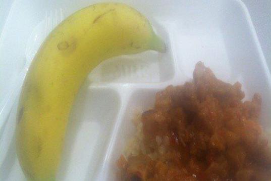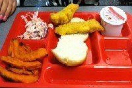 En la imagen se puede ver una bandeja con un trozo de pescado, una sopa y un trozo de pan.