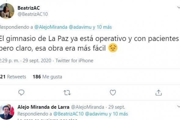 Tras ese mensaje, la usuaria @BeatrizAC10 respondió: “El gimnasio de La Paz ya está operativo y con pacientes pero claro, esa obra era más fácil”.