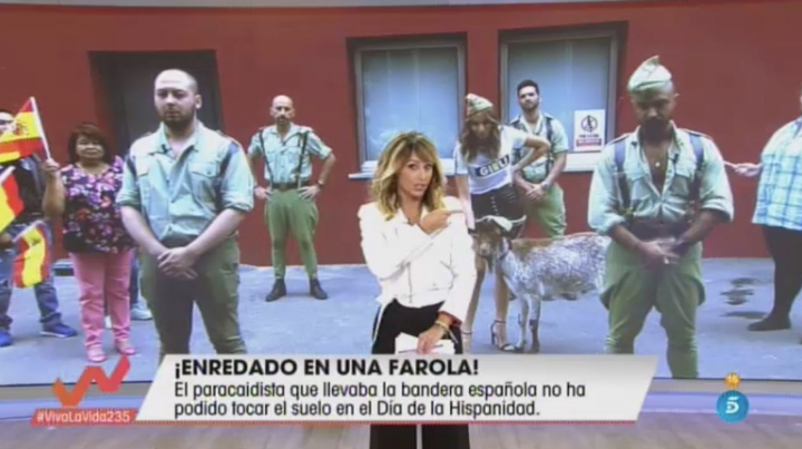 Antes de poder ver a la presentadora, el programa ha emitido las imágenes del paracaidista Luis Fernando Pozo, miembro de la Brigada Paracaidista (Bripac), enganchándose a una farola cuando iba a aterrizar en pleno desfile militar celebrado este sábado en Madrid.
