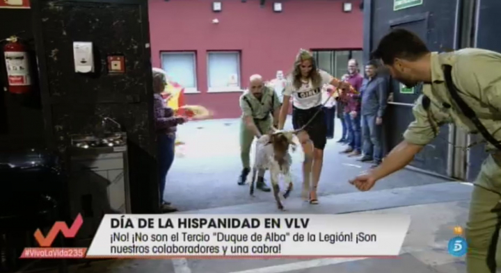 “Ahí los tienen”, ha dado paso la presentadora mientras, tras ella, en la pantalla grande, hemos podido ver a los colaboradores del programa vestidos con el uniforme de la Legión y con una cabra junto a ellos.