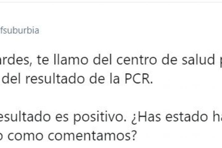 - Buenas tardes, te llamo del centro de salud para informarte del resultado de la PCR. - Sí, dime. - Mira, el resultado es positivo. ¿Has estado haciendo el aislamiento como comentamos? - Sí... bueno, el otro día estuve en la inauguración de un bar, ¿tengo que avisar a alguien?