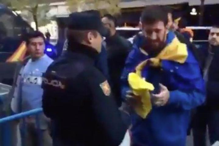 En uno de los numerosos controles policiales establecidos en torno al feudo madridista, se ha podido ver a un agente de la Policía Nacional requisando a un aficionado de Boca Juniors, club cuyos colores son amarillo y azul, una prenda de color amarillo.