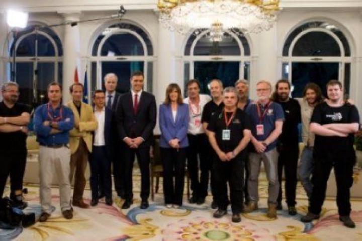 Una vez terminada la entrevista, Sánchez compartió una fotografía con los periodistas y con otro grupo de miembros de la cadena pública, todos hombres.