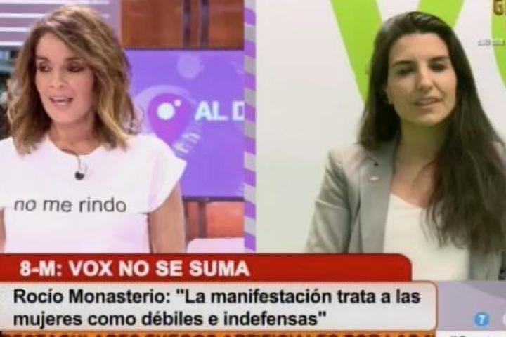La presentadora ha explicado por qué: "Habrán visto ustedes que nuestros contertulios no han podido preguntar. Y es que Rocío Monasterio nos ha dicho que, si entraba en directo con nosotros, era con la condición de que yo sólo le pudiera preguntar".