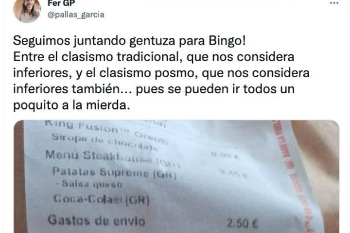 “Seguimos juntando gentuza para Bingo! Entre el clasismo tradicional, que nos considera inferiores, y el clasismo posmo, que nos considera inferiores también...”, ha escrito Pallas en Twitter junto a la imagen antes de añadir: “Pues se pueden ir todos un poquito a la mierda”.