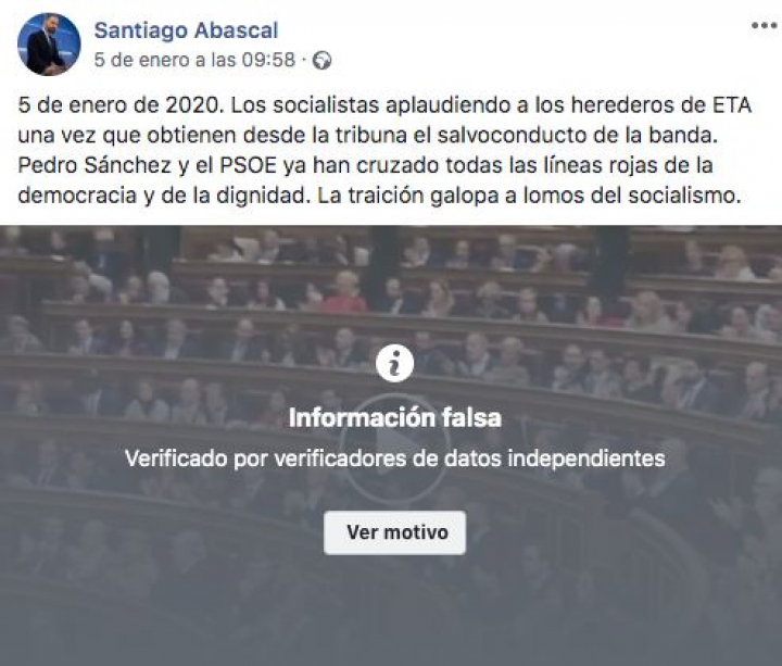 "Información falsa": Facebook corrige esta publicación de Santiago Abascal sobre la sesión de investidura