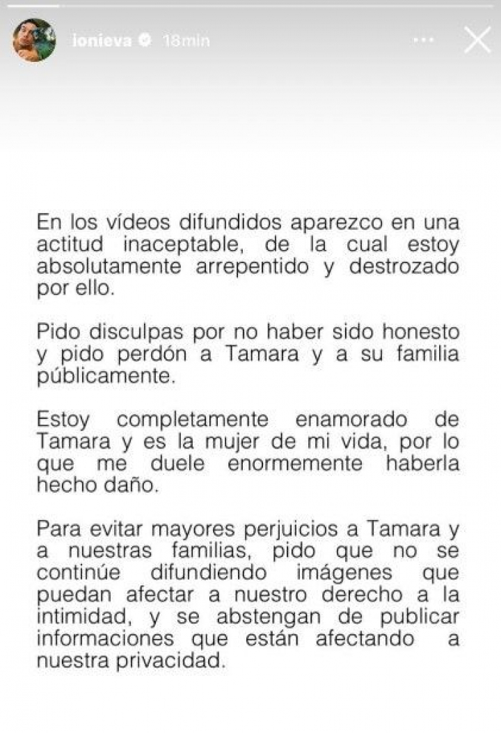 “En los vídeos difundidos aparezco en una actitud inaceptable, de la cual estoy absolutamente arrepentido y destrozado por ello. Pido disculpas por no haber sido honesto y pido perdón a Tamara y a su familia públicamente”, ha iniciado.