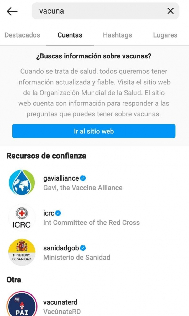 Encontrar esta clase de desinformación en Instagram es tan sencillo como introducir vaccines o vacunas en el buscador. Yo misma lo he probado desde distintas cuentas, incluidas algunas recién creadas, y siempre los perfiles de los antivacunas aparecen entre los primeros resultados, bien posicionados arriba. Visto lo visto, la advertencia de “Visita el Centro de información sobre el COVID-19 para acceder a recursos sobre vacunas” que incluyen en estas publicaciones e historias no tiene demasiada credibilidad.