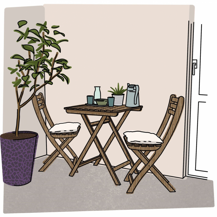 Escoge el mobiliario en función del espacio del que dispones y del número de comensales que se sentarán alrededor de la mesa. Si tienes un gran jardín, piensa que de vez en cuando podrás organizar cenas con más invitados. Si tienes una pequeña terraza, una mesa con cuatro sillas puede ser la solución perfecta.
