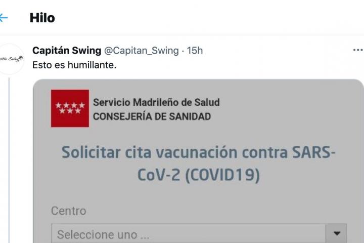 “Esto es humillante”, se puede leer en el primer tuit con un pantallazo de la web para coger cita para vacunarse en la región que dirige Isabel Díaz Ayuso.