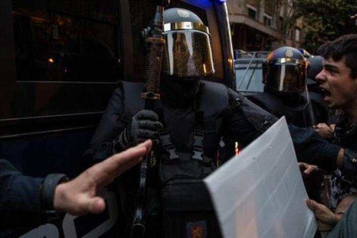 Un manifestante se tumba en una estelada junto a los Mossos d'Esquadra a las puertas de la Consellería de Economía en Barcelona en la madrugada del miércoles 20 de septiembre al jueves 21 de septiembre.