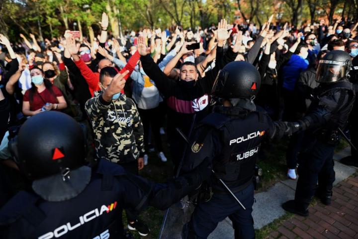 Police clash with people during a demonstration against a political rally of far-right party Vox ahead of regional elections in Madrid's suburb of Vallecas on April 7, 2021. (Photo by JAVIER SORIANO / AFP) (Photo by JAVIER SORIANO/AFP via Getty ...