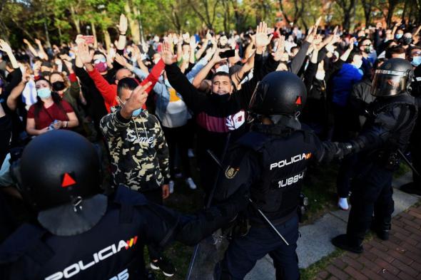 Police clash with people during a demonstration against a political rally of far-right party Vox ahead of regional elections in Madrid's suburb of Vallecas on April 7, 2021. (Photo by JAVIER SORIANO / AFP) (Photo by JAVIER SORIANO/AFP via Getty ...
